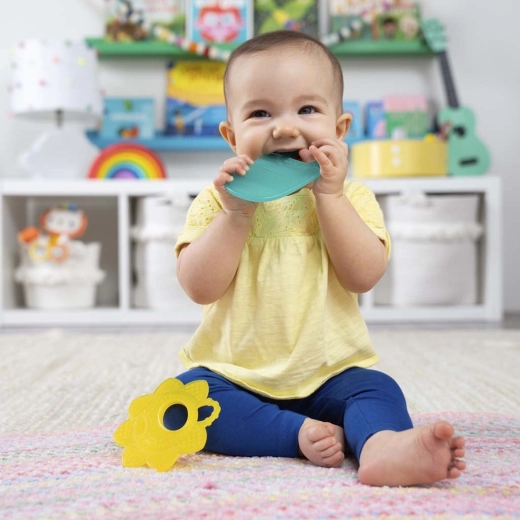 Pomirite občutljive dojenčkove dlesni z dvojico grizal Bright Starts Sunny Soothers. Zahvaljujoč mehkim teksturam, ščetinicam za nežno masažo, enostavnemu oprijemu in materialu brez BPA prinašajo hitro olajšanje ob izraščanju zobkov ter spodbujajo senzorično stimulacijo in fino motoriko.