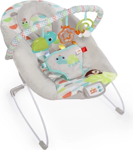 Pomirite in zabavajte svojega dojenčka z ležalnikom Bright Starts Happy Safari, ki ponuja pomirjujoče vibracije, prijetne melodije z nastavljivo glasnostjo in izjemno mehko oblazinjenje za maksimalno udobje. Odstranljiva igralna loka s tremi igračkami spodbuja čutni in motorični razvoj, medtem ko tritočkovni pas in nedrseče nogice zagotavljajo varnost.
