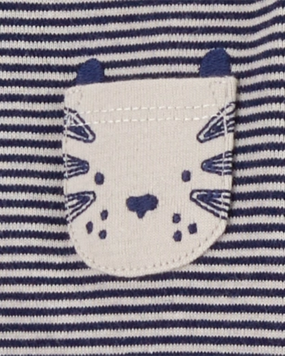 Komplet 4 otroških bodijev z dolgimi rokavi v modernih tonih temno modre in olivne z igrivimi živalskimi motivi je zasnovan za maksimalno udobje najmlajših. Mehek, zračen in do občutljive kože nežen 100% bombaž zagotavlja celodnevno udobje, medtem ko ojačan izrez ohranja obliko tudi po pogostem pranju.