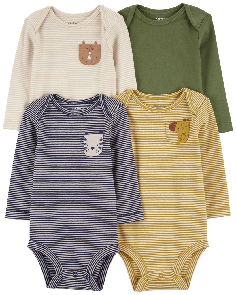 Odkrijte komplet štirih otroških bodijev iz izjemno mehkega 100% bombaža, idealnih za vsakodnevno nošenje novorojenčkov. Zahvaljujoč preklopnemu izrezu in pritiskačem med nogicami sta preoblačenje in previjanje hitra in enostavna. Slogovni vzorci in barve v kombinaciji z udobjem, zračnostjo in pritiskači brez niklja naredijo ta komplet odlično osnovo otroške garderobe.