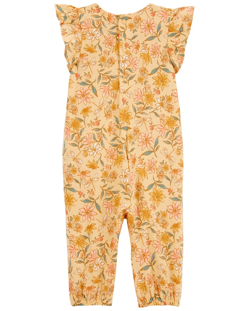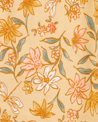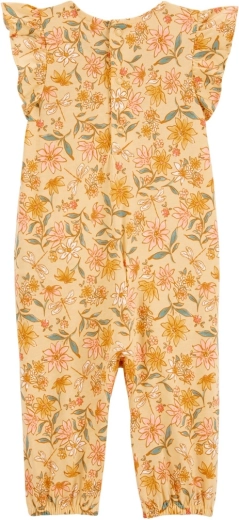 Ljubek otroški pajac brez stopal s kratkimi rokavi v nežnem rumenem cvetličnem dizajnu je idealen za vsakodnevno nošenje. Ponuja mehak 100% bombažni material, udoben kroj in patente brez niklja, prijazne do otroške kože.