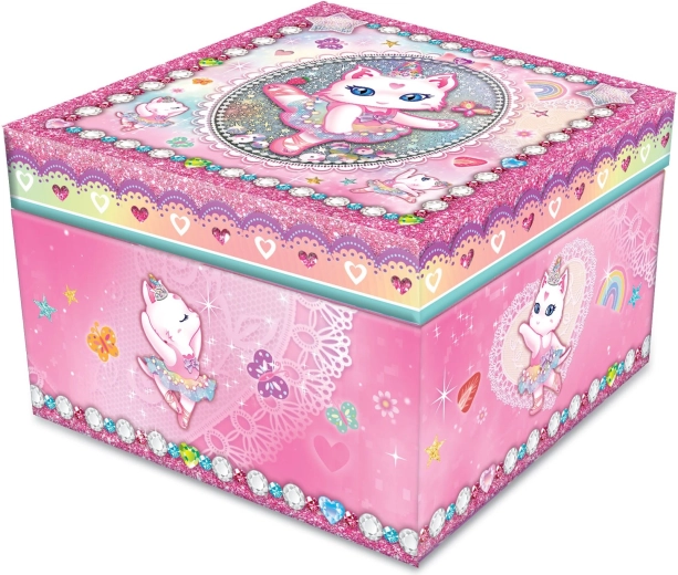 Ustvarite čarobno vzdušje v otroški sobi. Po odprtju pokrova se v odsevu ogledalca začne vrteti balerina-mucka, prostor pa napolni nežna glasba. Škatlica ima praktične predalčke za drobne zaklade in nakit, tako da bo vse lepo pregledno shranjeno.