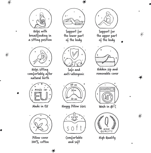 Blazina za dojenje Huggy je zasnovana za vsakodnevno udobje med nosečnostjo in po porodu. Nudi stabilno oporo trebuhu in hrbtu pri spanju na boku, po rojstvu pa razbremeni roke in hrbet pri dojenju ali hranjenju po steklenički. Zaradi oblike v U/C se zlahka prilagodi postavi in pomaga ohraniti pravilno držo, da sta hranjenje in počitek naravna in udobna.