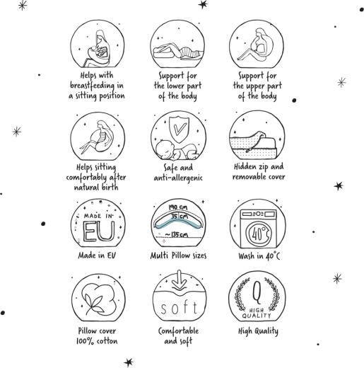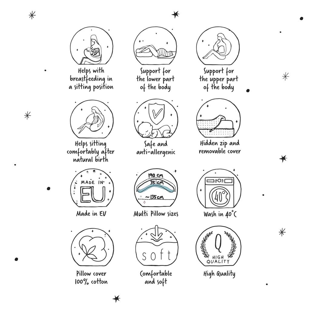Z dolžino 190 cm ponuja široke možnosti uporabe: kot opora za trebuh in hrbet pri spanju na boku, kot podpora pri dojenju ter kot varna pregrada za dojenčka. Certifikat OEKO‑TEX Standard 100 zagotavlja neškodljivost uporabljenih materialov.