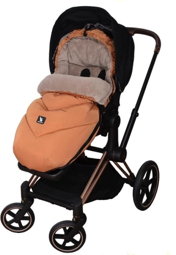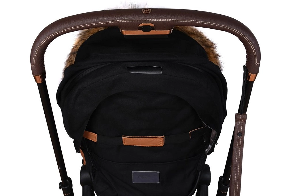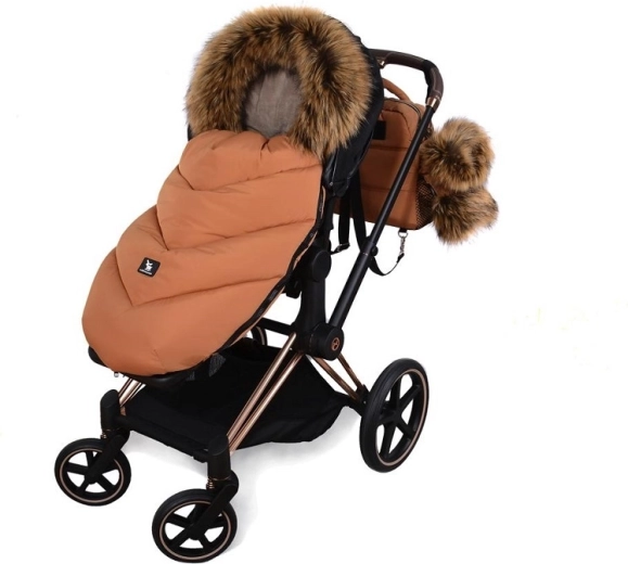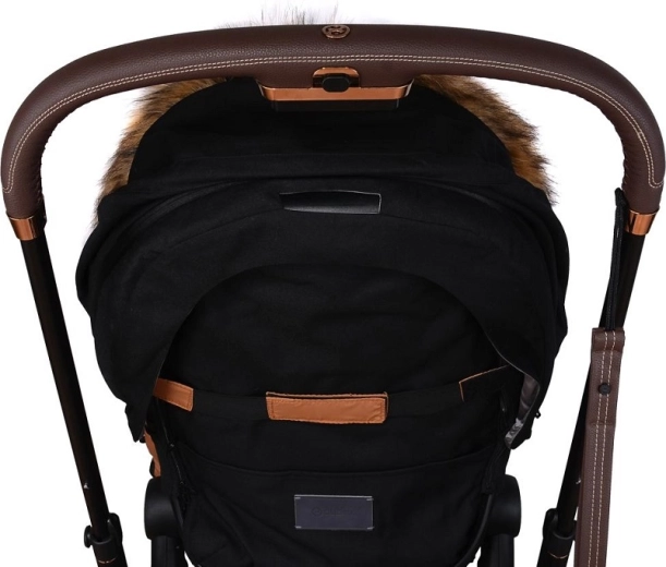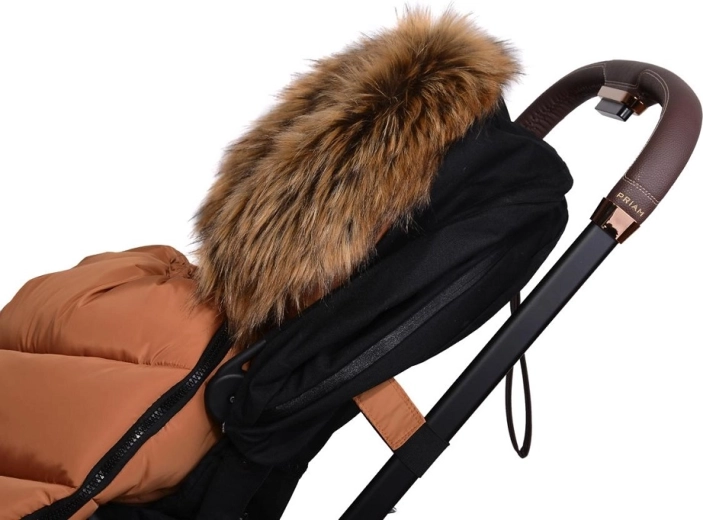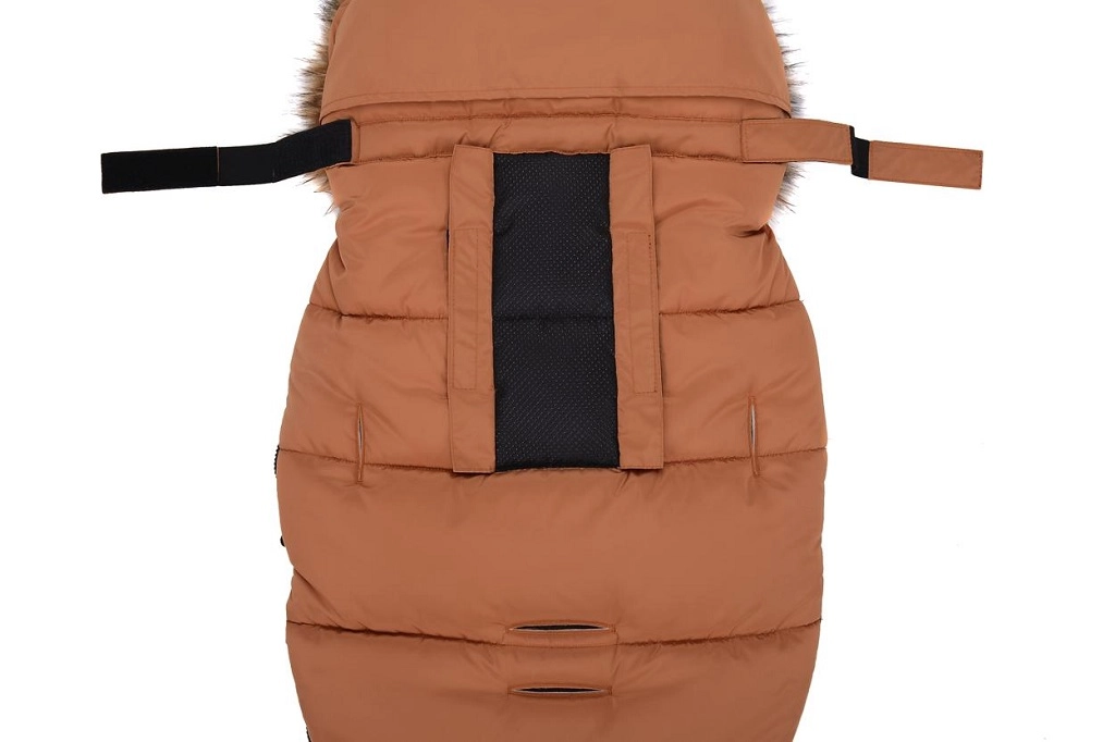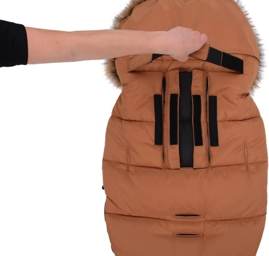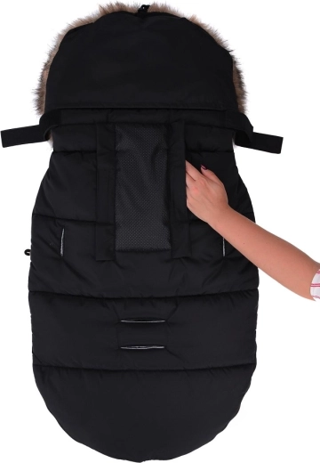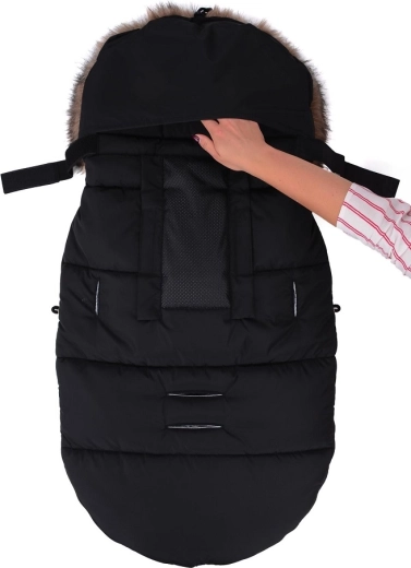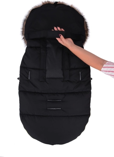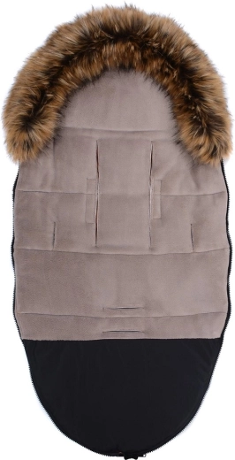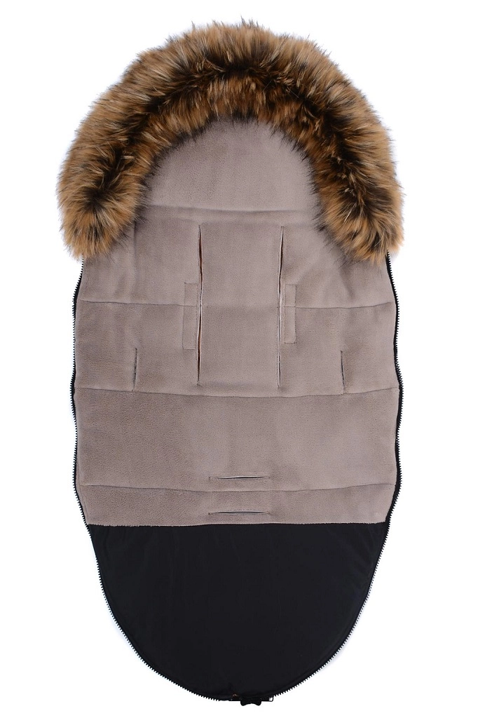 Praktično zapiranje na zadrgo omogoča hitro oblačenje in zračenje, sprednji del pa je mogoče po obeh straneh popolnoma odpeti. Zahvaljujoč odprtinam za 5-točkovni pas in zadnjemu traku za pritrditev na naslonjalo vreča trdno ostane na mestu v različnih tipih vozičkov. Stilski videz dopolnjuje odstranljivo umetno krzno na kapuci.