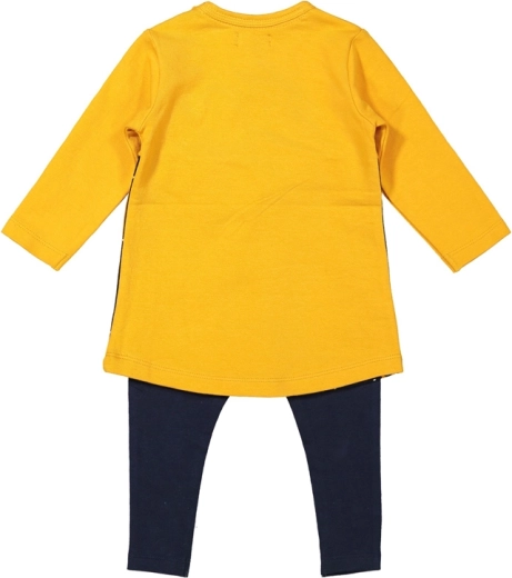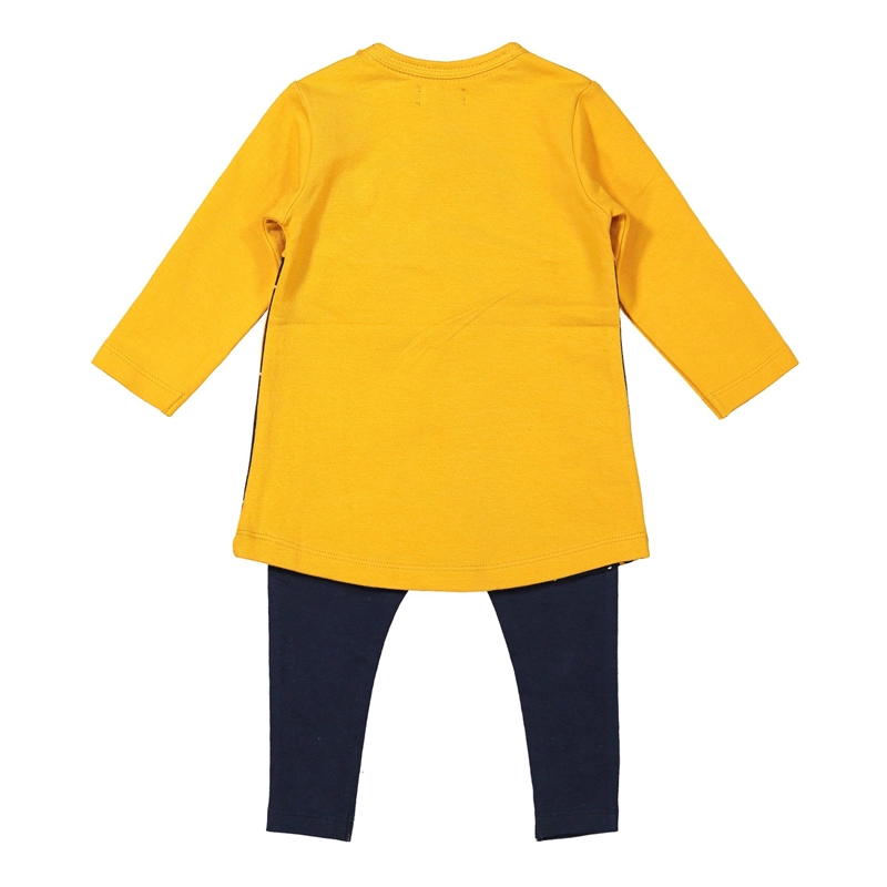 Oblecite vašo malo damo v udoben in kakovosten komplet, ki odlično drži obliko in je prijeten do otroške kože. Komplet vsebuje rumeno obleko in elastične legice, ki se popolno ujemajo ter olajšajo vsakodnevno oblačenje.