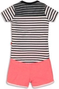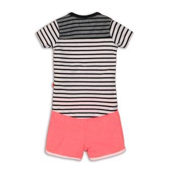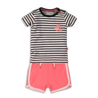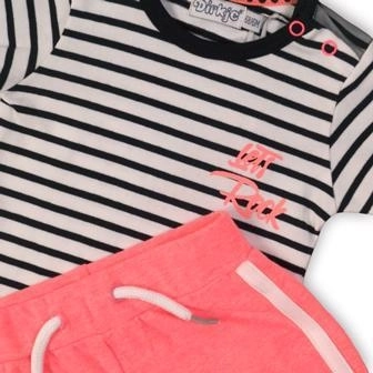 Oblecite svojega malčka v udobje in stil s kompletom DIRKJE, ki združuje praktičnost in srčkan dizajn. Črtasto majico v belo‑črni barvi z drobnim rožnatim motivom dopolnjujejo rožnate kratke hlače z belim robom. Zahvaljujoč mehkemu bombažu in dodatku elastana se oblačila lepo prilagodijo in ne omejujejo gibanja.