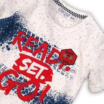 Zaradi univerzalne bele barve in igrivega potiska »Ready Set Go!« se majica odlično poda k kavbojkam, legicam in kratkim hlačam. Praktičen kos za vrtec, igrišče in prosti čas.