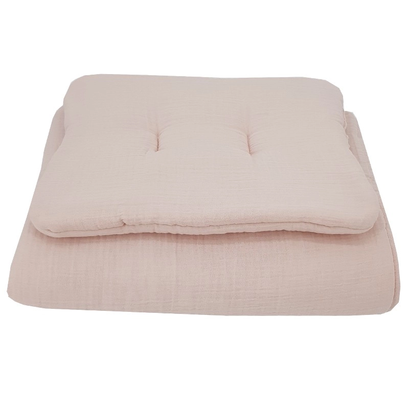 Usklajen vzglavnik 30 × 40 cm in odeja 75 × 100 cm lepo dopolnita otroško posteljico v nežnem odtenku powder pink.