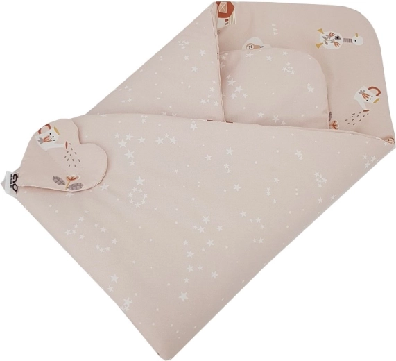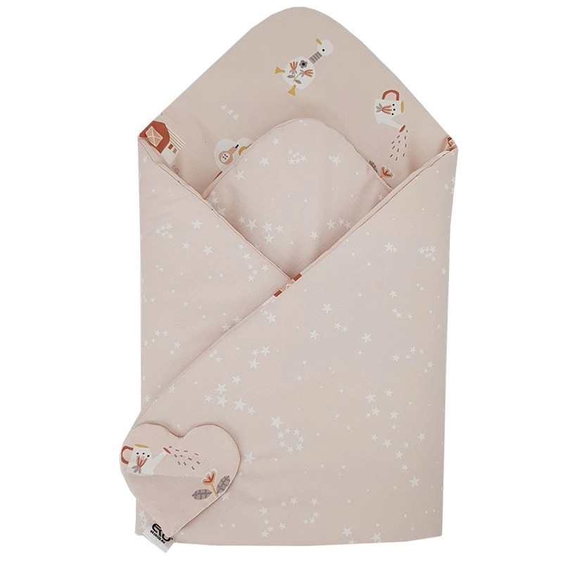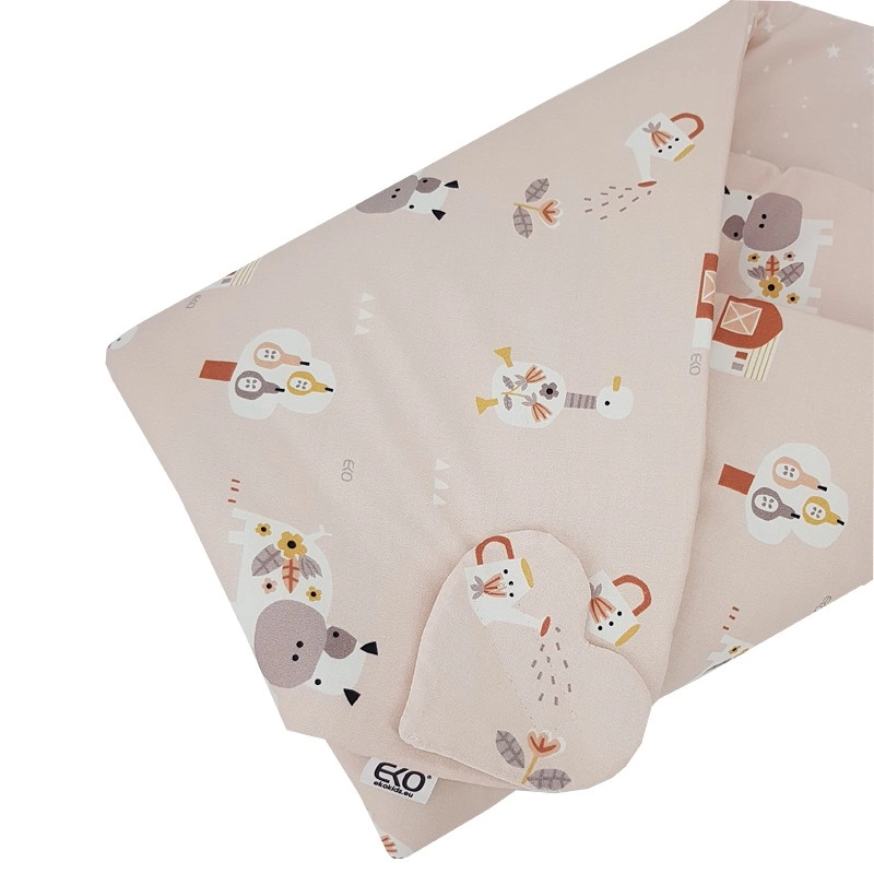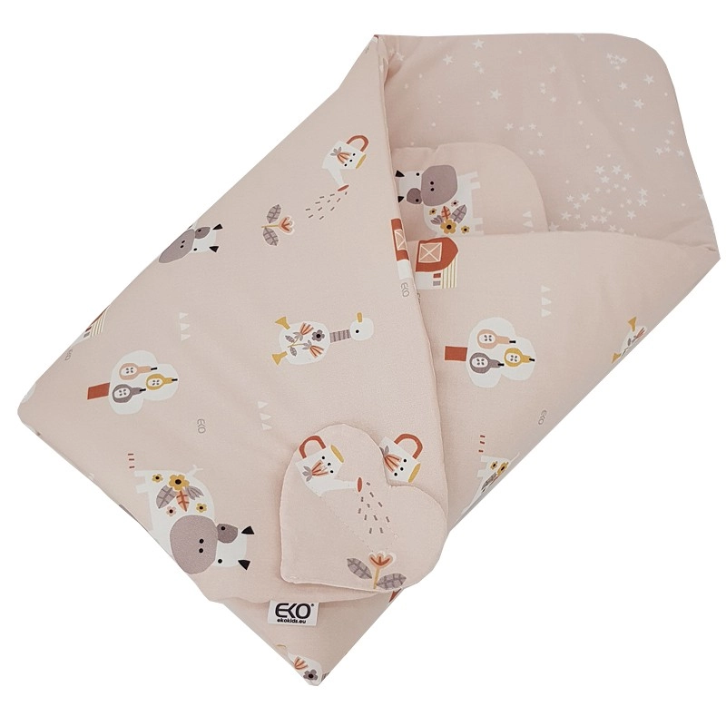 Povijalka EKO My Farm v pudrasto rožnati barvi je izdelana iz prijetnega, na otip zelo mehkega 100% bombaža z digitalnim tiskom. Dvostranska izvedba omogoča menjavo videza glede na razpoloženje in enostavno usklajevanje z opremo. Mehko in zračno hipoalergeno polnilo zagotavlja toploto in udobje pri spanju in crkljanju.