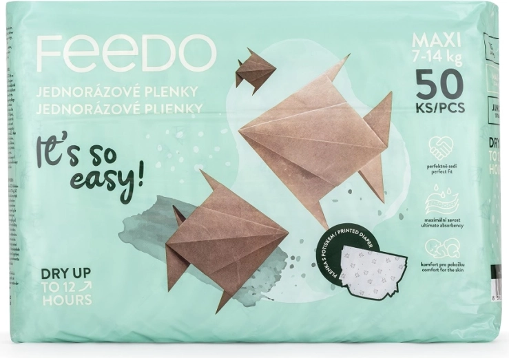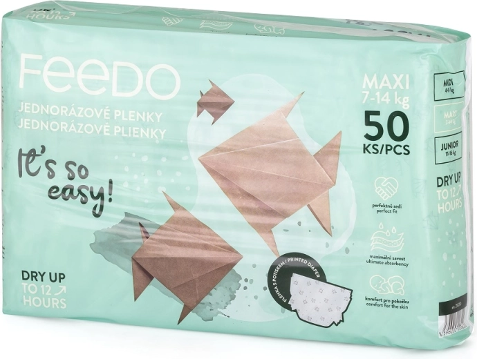 Pleničke FEEDO Maxi združujejo visoko vpojnost, zračnost in varno sestavo brez dišav in lateksa. Trislojno jedro hitro odvaja vlago in ohranja kožo suho, medtem ko elastične manšete okoli nog in prožen pas zagotavljajo varno, a udobno prileganje brez omejevanja gibanja.