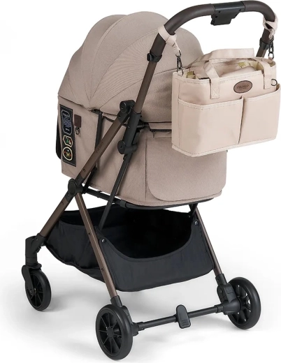 Organizator je zasnovan tako, da ustreza večini vozičkov, njegova čvrsta oblika pa ohranja vsebino pregledno tudi med vožnjo. Bež izvedba se zlahka ujema z različnimi slogi vozičkov, kakovostni materiali pa omogočajo preprosto čiščenje.