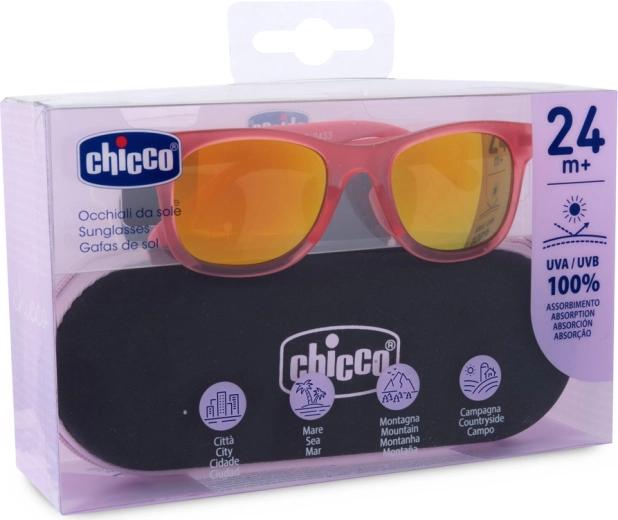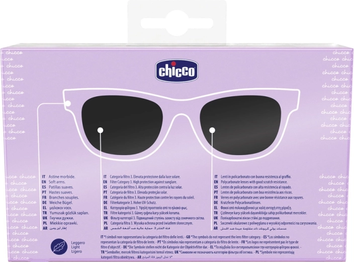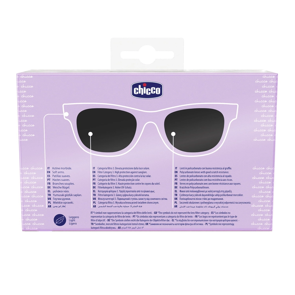 Stilska otroška sončna očala CHICCO zagotavljajo 100 % UVA/UVB zaščito in imajo temen filter kategorije 3. Zahvaljujoč fleksibilnim, hipoalergenim in nestrupenim okvirjem so udobna in varna za vsakodnevno nošenje. Vzdržljiv polikarbonat ščiti pred udarci in praskami, priloženo je tudi praktično tekstilno etui.