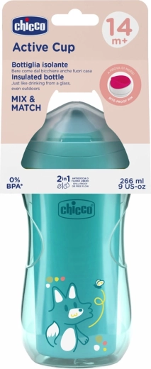 Chicco Active je trpežen termo lonček, zasnovan za otroke od 14 mesecev, ki se učijo samostojnega pitja. Tanek trd ustnik s čvrstim robom pomaga pri prehodu na pitje kot iz kozarca, medtem ko zanesljiv ventil omejuje pretakanje med pitjem in gibanjem. Ergonomična oblika dobro sede tudi v majhne ročice.