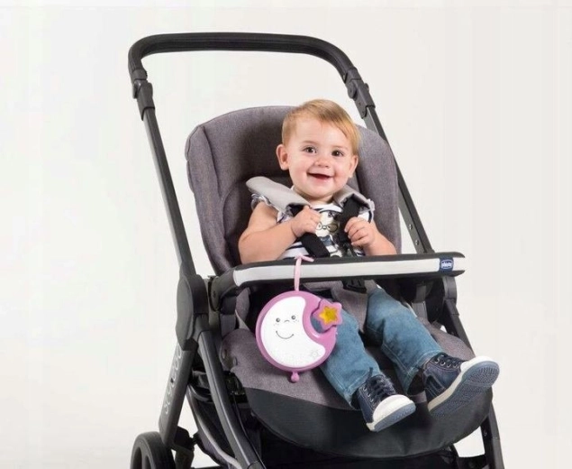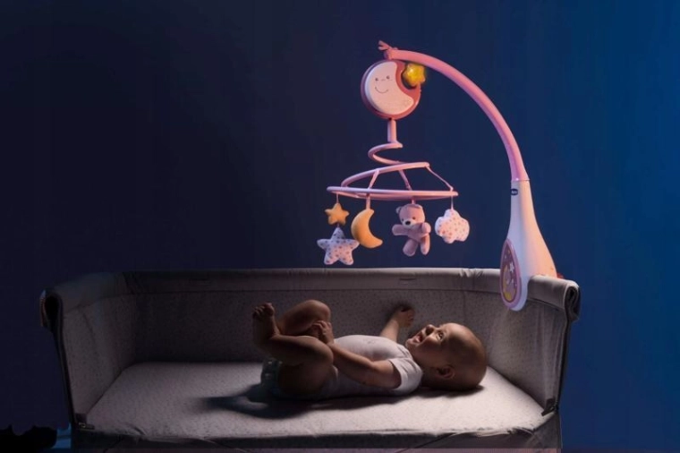 Zahvaljujoč odstranljivi elektronski enoti z lučko v obliki lunice je izdelek uporaben tudi izven posteljice – enoto preprosto obesite na rob posteljice, v voziček ali na ročaj avtosedeža. Vrteča se spirala z mehko, hipoalergeno tkanino in štirimi visečimi igračkami spodbuja vid in osredotočenost otroka ter podpira mirno uspavanje.