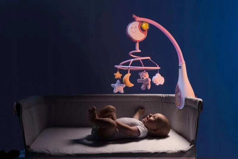 Pomirite dojenčka z nežnim gibanjem in melodijami s stilskim vrtiljakom CHICCO Next2Dreams 3v1. Ponuja nočno lučko, 20 minut glasbe in belega šuma, vrtečo se spiralo z visečimi igračkami ter preprosto pritrditev na posteljice, vključno z Next2Me. Odstranljiva glasbena enota z lučko je uporabna tudi v vozičku ali avtosedežu.