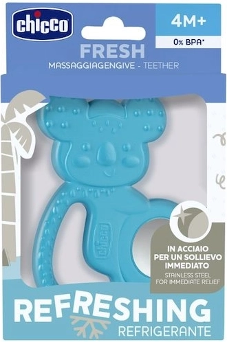 Hladilno grizalo CHICCO Fresh Koala v modri barvi je zasnovano za občutljive dlesni najmlajših. Preprosto ga lahko ohladite v hladilniku ali v hladni vodi s kockami ledu, da zagotovi hitro olajšanje bolečin pri izraščanju zob. Mehak silikon nežno masira dlesni, ergonomska oblika pa dobro sede tudi v majhne ročice.