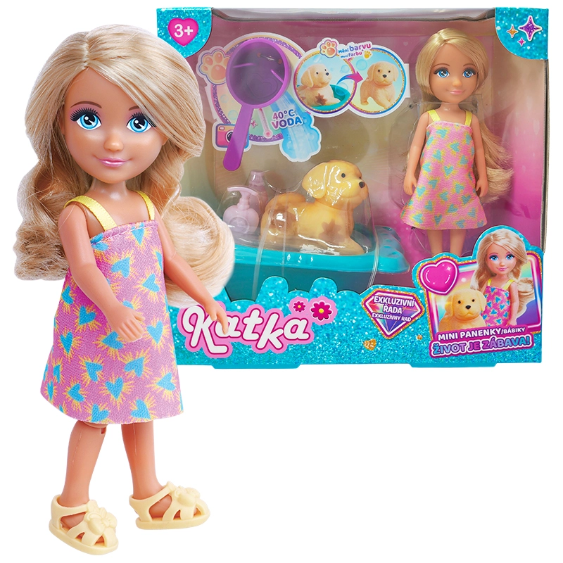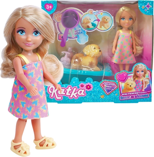Set Lutka Katka s psom in kadjo bo razveselil vsako malo skrbnico. Lutka ima dolge lase, primerne za česanje, in barvita oblačila; pasji prijatelj spodbuja izmišljevanje zgodb, kad v veselih barvah pa dopolni kopalne rituale lutke. Zaradi kakovostnih materialov je igra varna in odporna za vsakodnevno uporabo.