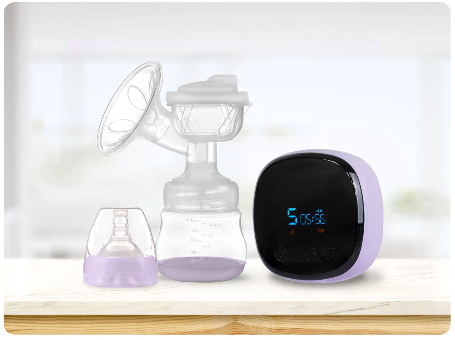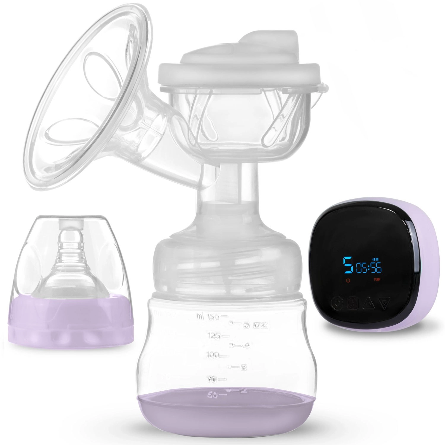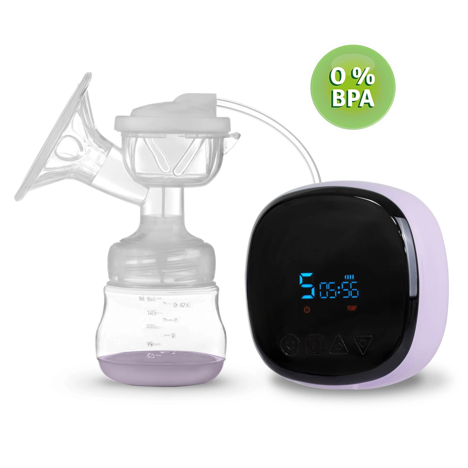 Z intuitivno nadzorno ploščo z LCD izberete način (stimulacija, masaža, globoko črpanje), prilagodite intenziteto in preverite stanje baterije. Črpalka je zelo tiha, enostavno se razstavi in očisti. Je brez BPA za največjo varnost otroka. V pakiranju najdete stekleničko 150 ml, dudko, napajalni adapter in 2 sterilni vrečki za mleko z navojnimi zapirali.
