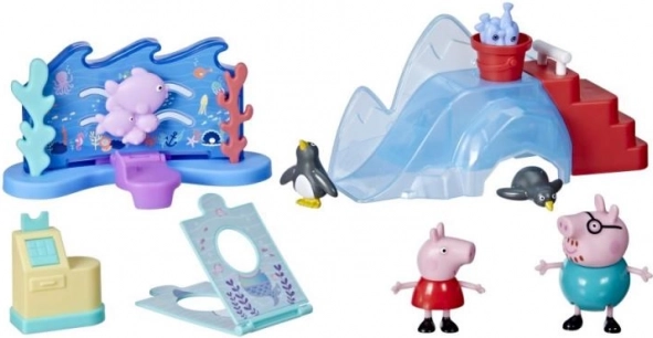 - Igralna scena akvarija, figurica Pepe, figurica očka, 2 pingvina, vedro rib, vrtljivo stojalo s fotografijami, aktivno ozadje, blagajna z gumbom in vstopnico, mehur z morsko zvezdo