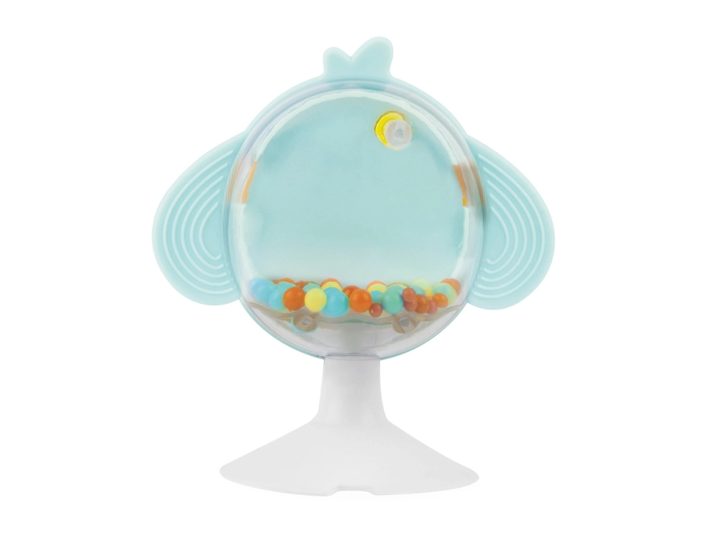 Stabilen prisesek drži igračo na pladnju stolčka. Teksturirana krilca iz mehkega plastika pomirjajo dlesni, barvite kroglice v telesu spodbujajo slušno in vidno stimulacijo.