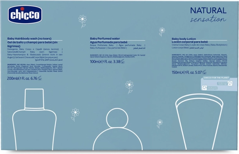 Odkrijte nežno nego od prvega dne z darilnim kompletom Chicco Natural Sensation Baby Essential. Trije osnovni izdelki brez alkohola spoštujejo občutljivo otroško kožo in naravni pH. Komplet vključuje 2v1 šampon za lase in telo z alojo in kamilico, hranilno mleko za telo s karitejevim maslom in vitaminom E ter nežno dišečo vodo z nežnim vonjem. Dermatološko in pediatrično testirano, primerno od rojstva, izdelano v Italiji.