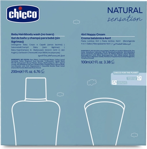 Darilni set CHICCO Natural Sensation Daily Protection je odlična izbira za vsakodnevne negovalne rituale za dojenčka. Šampon in čistilni gel 2v1 nežno očisti ter pusti kožo in laske mehke in lahko razčesljive, medtem ko krema za ritko s cinkom ustvari zaščitno pregrado ter učinkovito preprečuje draženje in rdečico.