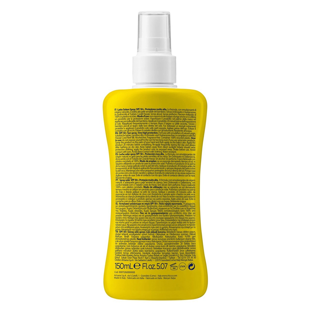 Zaščitni sprej Chicco je razvit posebej za potrebe občutljive otroške kože. Zahvaljujoč zelo visokemu faktorju SPF 50+ in fotostabilnim filtrom učinkovito ščiti pred UVA, UVB ter infrardečim (IR) sevanjem. Enostavno se nanaša, hitro se vpije in ne pušča mastnega filma.