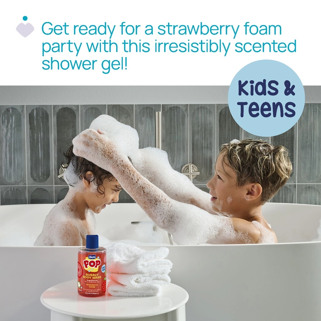 Chicco POP Strawberry Candy spremeni vsako prhanje v dišeč ritual, poln veselja. Lahka, bogato penasta tekstura nežno očisti in pusti kožo mehko ter sveže odišavljeno s sladko jagodno aromo, ki jo bodo vzljubili tako otroci kot najstniki.