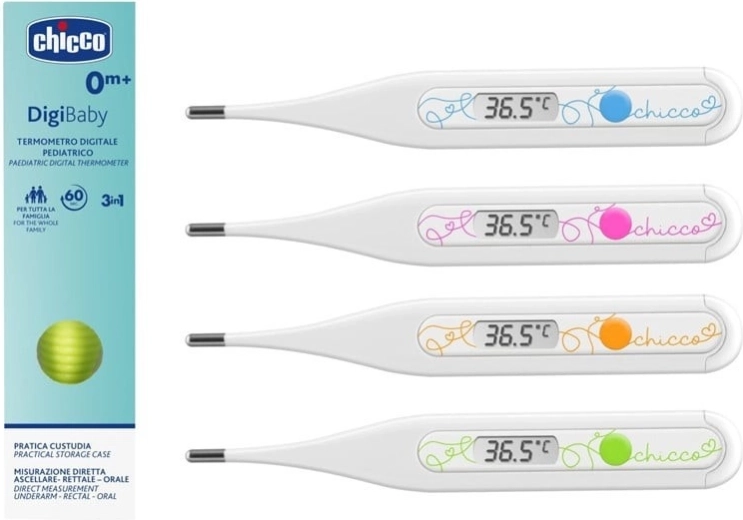 Digitalni termometer Chicco Digi Baby zelen je zasnovan za nežno in zanesljivo merjenje telesne temperature pri najmlajših. Posebno oblikovana konica povečuje udobje med merjenjem, univerzalna uporaba (aksilarno, rektalno, oralno) pa zagotavlja prilagodljivost v vsaki situaciji. Zahvaljujoč zvočnemu signalu po zaključku merjenja in alarmu za vročino boste vedno imeli jasen nadzor nad rezultati.