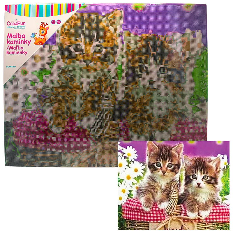 Diamantno slikanje – muckice 40 × 50 cm prinaša otrokom in odraslim sproščujoče ustvarjanje z lepim rezultatom. Platno s predtiskanim motivom in zaščitno folijo jasno označuje mesta za posamezne kamenčke, zato lahko uživate v postopku sestavljanja brez nepotrebnega stresa. Vse sestavine so iz kakovostnih materialov za varno in udobno uporabo.