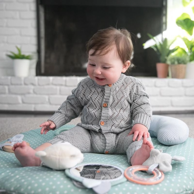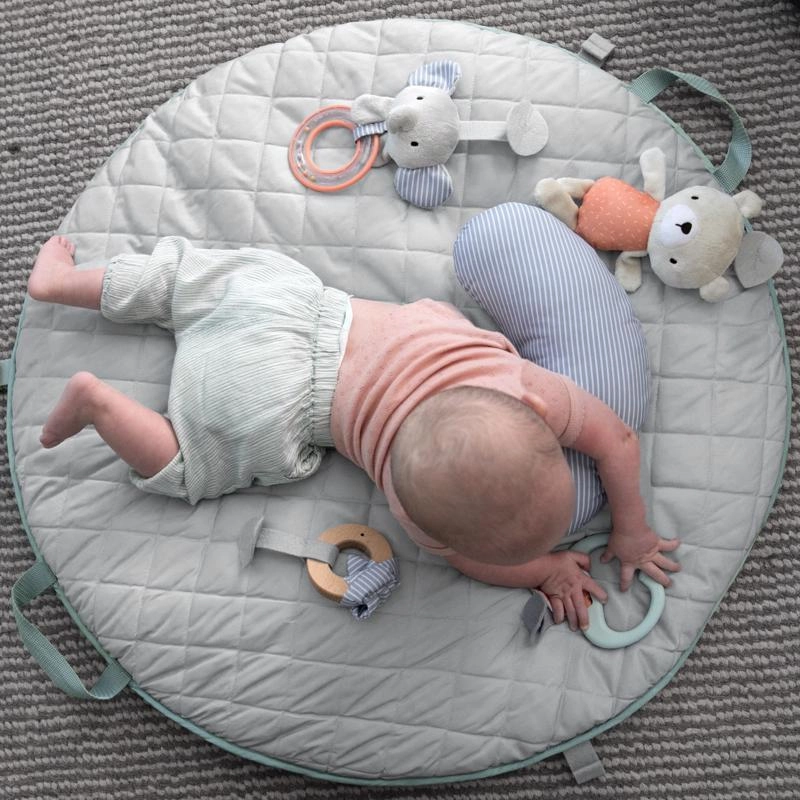 Podloga je zasnovana za vsakodnevno uporabo: preprosta za vzdrževanje, pralna v pralnem stroju, loki so odstranljivi, celoten komplet pa hitro zložite zahvaljujoč funkciji Slim Fold – idealno za shranjevanje in prenašanje. Priložena je tudi mehka podporna blazinica za udobno »pasenje kravic«.