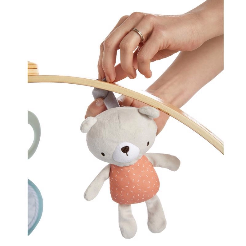 Dva prekrižana loka v lesenem slogu z mehkimi živalicami, grizali in varnostnim ogledalcem spodbujata vid, tip in prve prijeme.