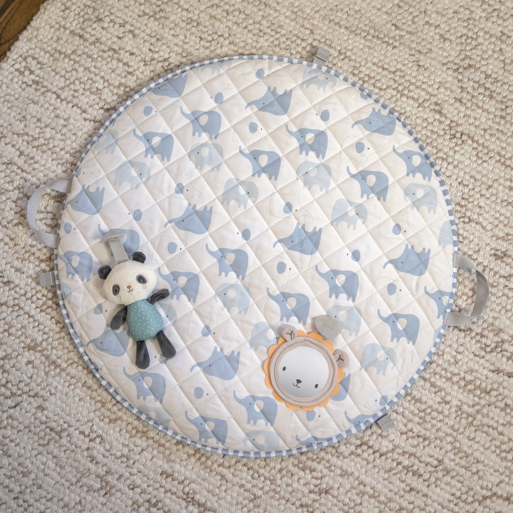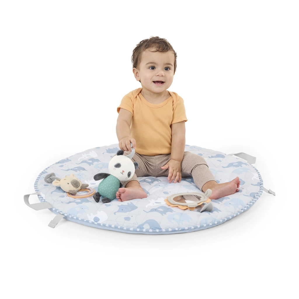 Razkošno mehka in prostorna podloga z oblačasto strukturo zagotavlja udobje od rojstva do 36 mesecev. Minimalističen, dvostranski potisk se odlično poda v vsak interier, medtem ko trdno leseno igralno stojalo z igračami spodbuja koordinacijo oči in rok, prijemanje ter sledenje.