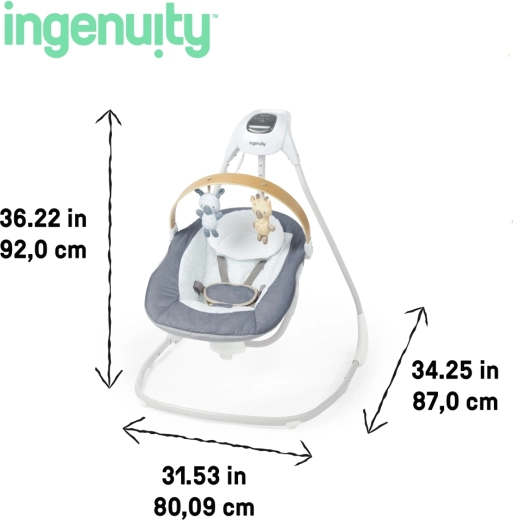 Ingenuity SimpleComfort Chambray je premišljen otroški gugalnik, ki združuje udobje, varnost in zabavo v enem. Vrtljiv sedež za 180° omogoča guganje v treh smereh, zato lahko zlahka prilagodite gibanje in smer stika s staršem. Tehnologija TrueSpeed ohranja izbrano hitrost guganja glede na otrokovo težo, motor WhisperQuiet pa zagotavlja maksimalno tiho delovanje.