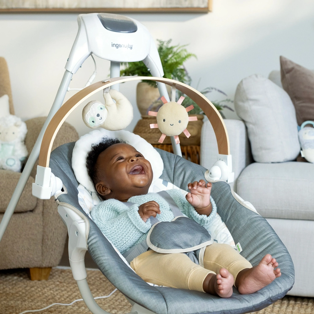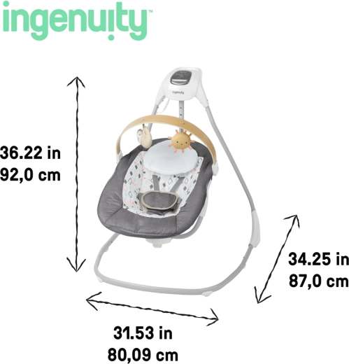 Pomirite in zabavajte svojega malčka s kompaktnih gugalnikom INGENUITY SimpleComfort Parker. Ponuja vrtljiv sedež za 180°, guganje v 3 smereh, 6 hitrosti s tehnologijo TrueSpeed, tih WhisperQuiet motor ter 8 melodij + 3 zvoke narave. Priročno USB napajanje, odstranljiv lesen lok z 2 igračama in kompaktna zasnova z ročajem in kolesci olajšajo premikanje in shranjevanje. Za otroke od rojstva do 9 kg.