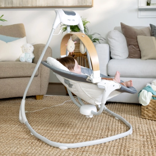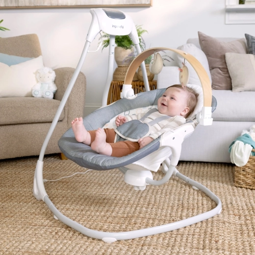 Gugalnik Ingenuity SimpleComfort Parker prinaša udobje, mir in slog v vsak dom. Vrtljiv sedež za 180° omogoča guganje v treh smereh, zato zlahka najdete položaj, ki vašemu malčku najbolj ustreza. Tihi motor WhisperQuiet, 6 hitrosti s tehnologijo TrueSpeed in časovnik z samodejnim izklopom zagotavljajo gladko in nemoteno guganje.