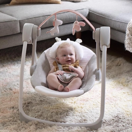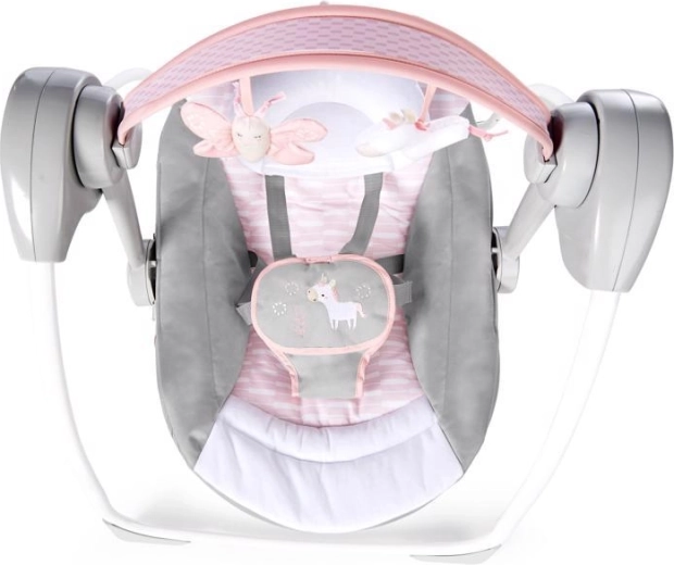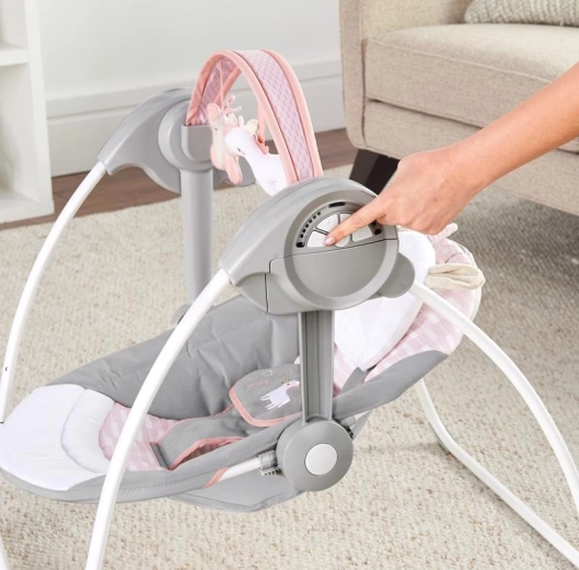 Ingenuity Flora the Unicorn je lahka in zelo kompaktna gugalnica, ki prihrani prostor, ne pa funkcij. S tehnologijo ComfortRecline zlahka nastavite celoten sedež v dva udobna položaja, medtem ko WhisperQuiet zagotavlja zelo tih tek za nemoteno guganje in počitek.