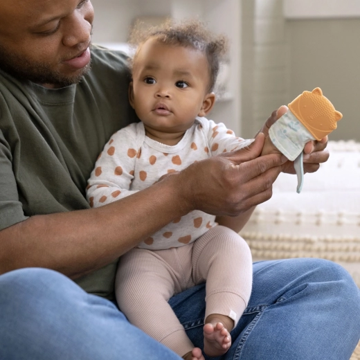 Rokavička je odlična izbira za najmlajše, ki še ne morejo držati klasičnega grizala. Ščiti pred praskanjem obraza, preprečuje padanje in izgubo grizala ter teksture spodbujajo tipno raziskovanje. Kompaktne mere so idealne doma in na poti.