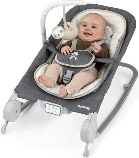 Pomirite dojenčka z edinstveno tehnologijo Happy Belly, ki nežno masira trebušček in pomaga pri napenjanju ter nemiru. Ležalnik INGENUITY se gladko spremeni v gugalnik, ponuja vibracije, 20 melodij in zvoke narave, mehko blazinico in varnostne 5-točkovne pasove. Zlahka se zloži na ravno in je s prenosno torbo idealen za na pot.