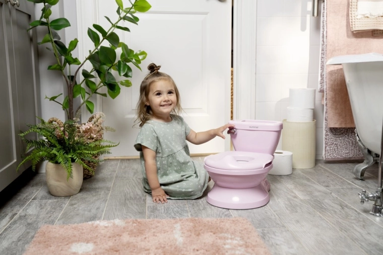 Otroci radi posnemajo odrasle. Kromirana ročica z resničnim zvokom splakovanja krepi navado in spremeni trening v zabavo.