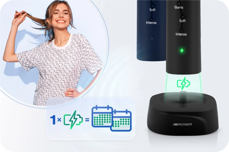 Dolg čas delovanja in priročno polnjenje: vgrajena baterija (pribl. 800 mAh) zdrži do 50 dni z enim polnjenjem. Indukcijska polnilna postaja USB omogoča varno in enostavno dopolnjevanje energije. Zasnova z IPX8 ščiti ščetko pred škropljenjem in potopitvijo v vodo, zato je idealna za kopalnico in potovanja.