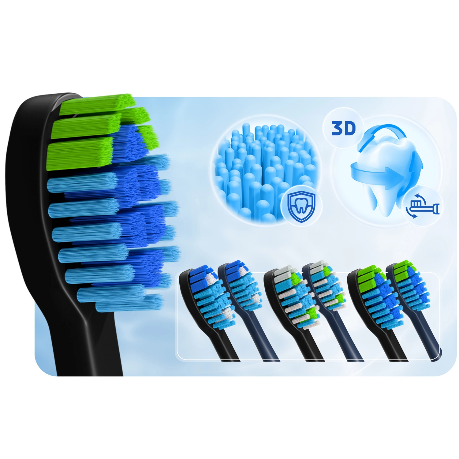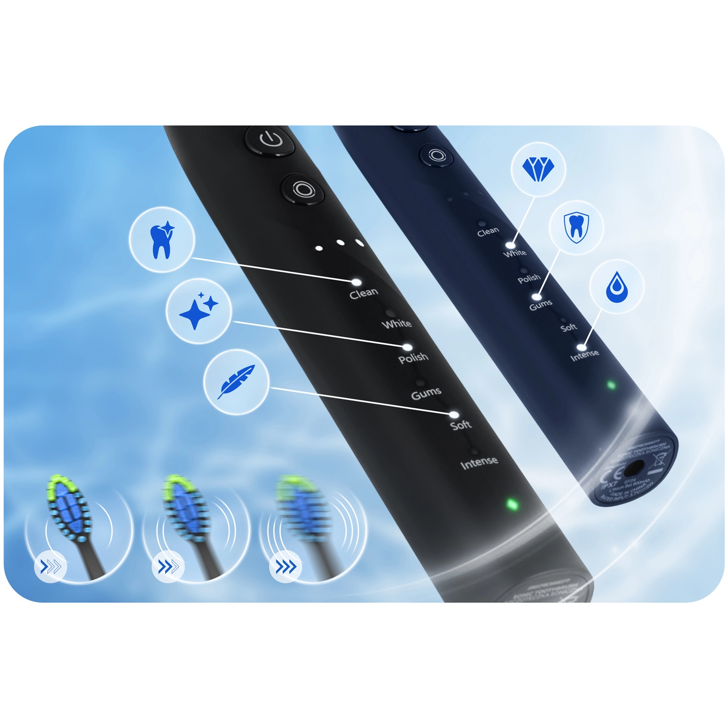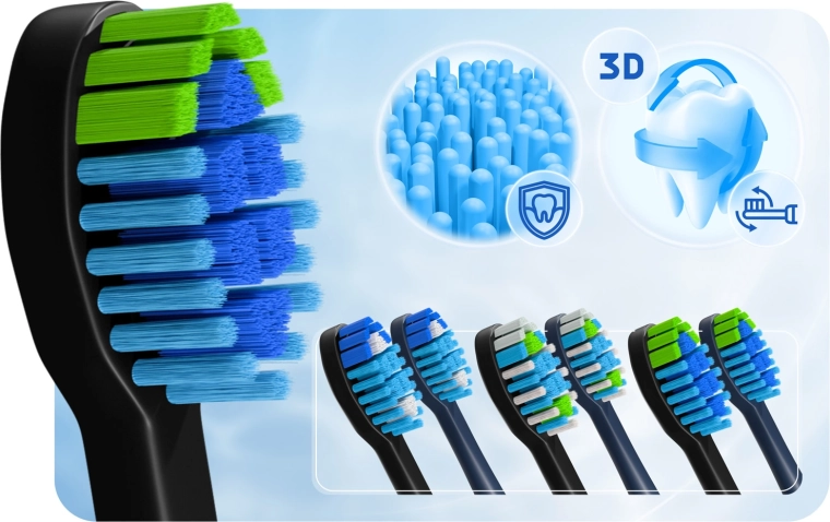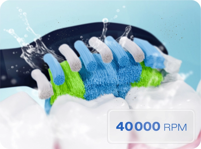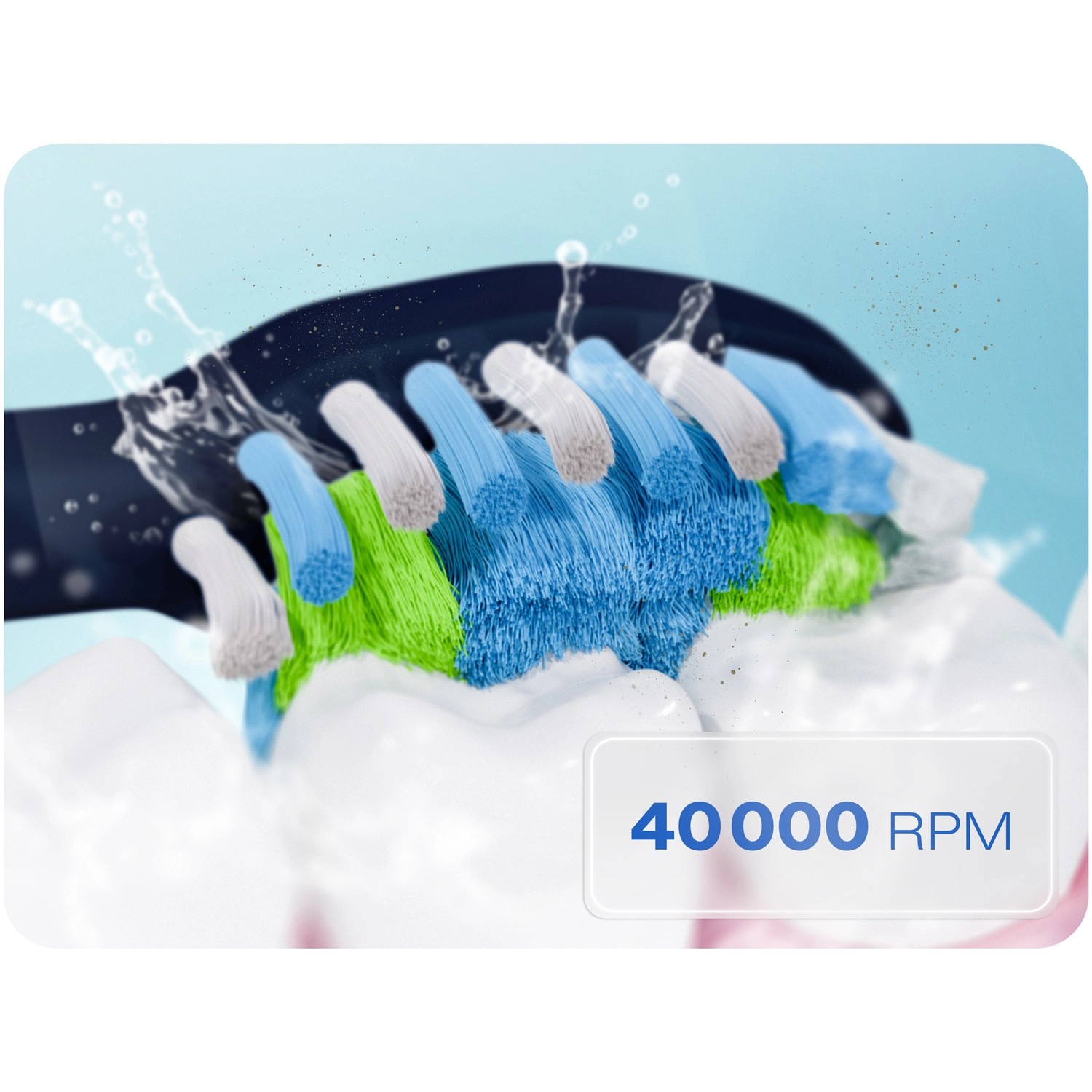 Moč sonične tehnologije hitro in nežno odstranjuje zobne obloge in zabarvanja. Glavice z mehkimi ščetinami se prilagodijo obliki zoba, zadnja stran pa omogoča enostavno čiščenje jezika za dolgotrajen svež dah. Zmogljiv motor ustvarja do 40.000 vibracij na minuto, pametni časovnik pa pomaga pri pravilnem in učinkovitem vsakodnevnem čiščenju.