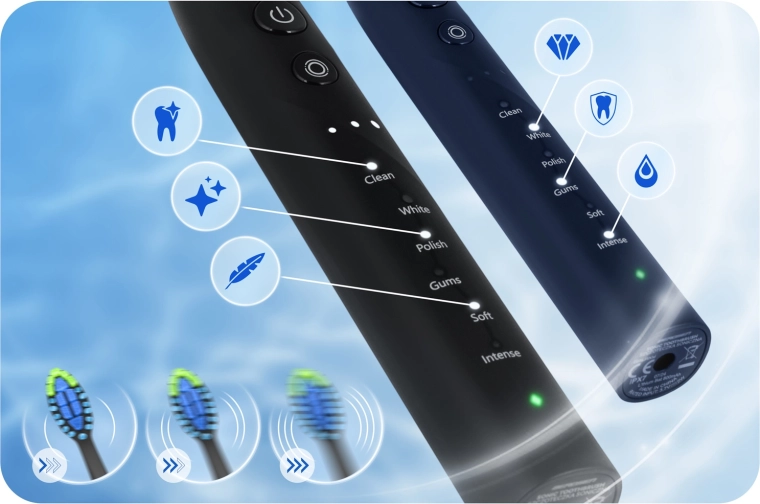 18 kombinacij čiščenja za vaše potrebe: 6 načinov (CLEAN, WHITE, POLISH, GUMS, SOFT, INTENSE) in 3 stopnje intenzivnosti. Od nežne nege za občutljive zobe do intenzivnega globinskega čiščenja – preprosto izberite pravo. Samodejni izklop po 2 minutah in 30‑sekundni intervali olajšajo razdelitev ust na štiri kvadrante za enakomerno čiščenje.