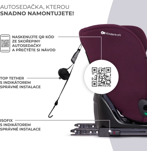 ISOFIX priključki in zgornji pas TOP TETHER z indikatorji pravilne namestitve zagotavljajo hitro montažo in stabilnost sedeža v vozilu.