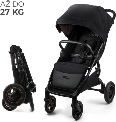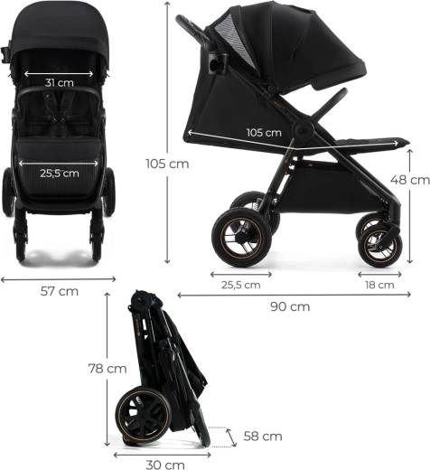 Voziček raste z vašim otrokom: ima stopenjsko nastavljivo naslonjalo za hrbet do ležečega položaja, 4 položaje opore za noge in 3-stopenjsko nastavljiv ročaj za starše. Praktično enoročno zlaganje navznoter ščiti prevleko pred umazanijo in olajša potovanja. Velika košara z nosilnostjo 5 kg sprejme nakupe in opremo.