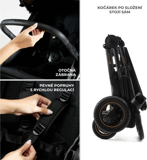 Velika zadnja in okretna sprednja kolesa z gumijastimi pnevmatikami ter vzmetenjem blažijo neravnine na tlakovcih, pesku in gozdnih poteh. Otrok se vozi udobno, vi pa potiskate lahkotno in stabilno.