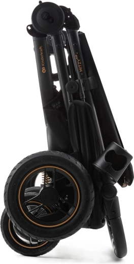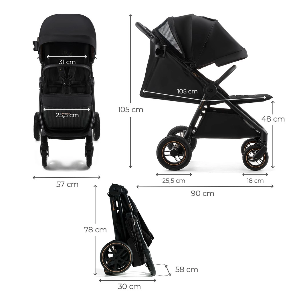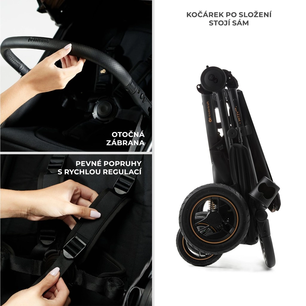 Mitzy Air je idealna izbira za aktivne družine, ki želijo udobje, varnost in stil v enem. Z napihljivimi kolesi in učinkovitim vzmetenjem zlahka premaguje robnike, tlakovce in pesek. Velika, vodotesna strešica z UPF50+ ščiti pred soncem in dežjem, prezračevalni panel in okence pa omogočata stalni stik in kroženje zraka.