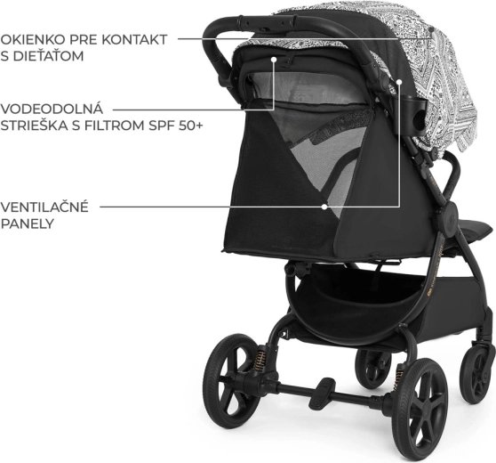 Velika nepremočljiva strešica z UPF50+ ščiti pred vetrom, dežjem in soncem, prezračevalni panel in okence za stik z otrokom pa zagotavljata optimalno kroženje zraka in pregled. Popolno vzmetenje in velika, neprebočna kolesa zlahka premagajo tlakovce in prod, medtem ko sprednja kolesa z vrtljivostjo 360° in možnostjo blokade povečujejo stabilnost v zahtevnejšem terenu. Zlaganje z eno roko v kompaktno velikost z zaščito prevleke pred umazanijo olajša potovanja in shranjevanje.