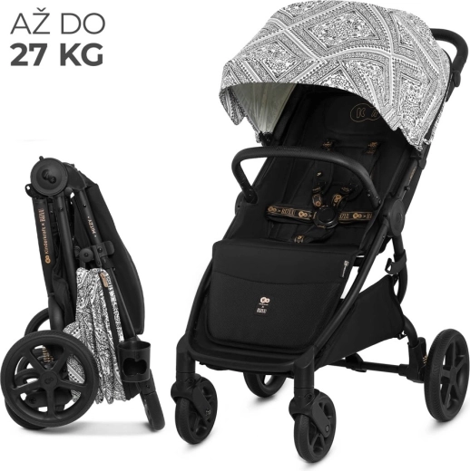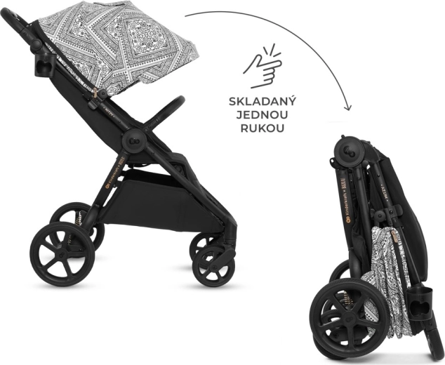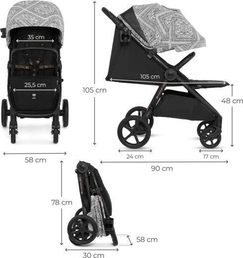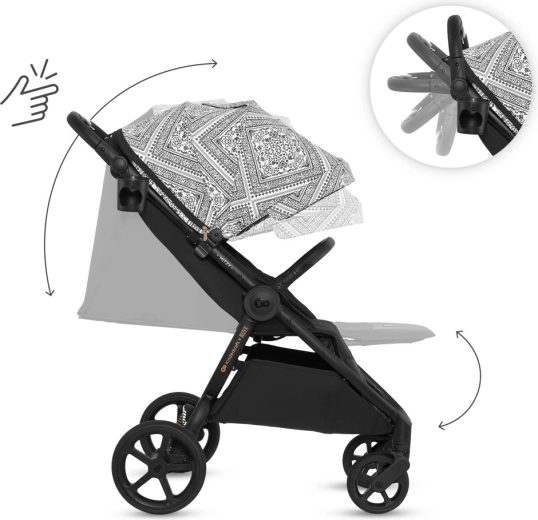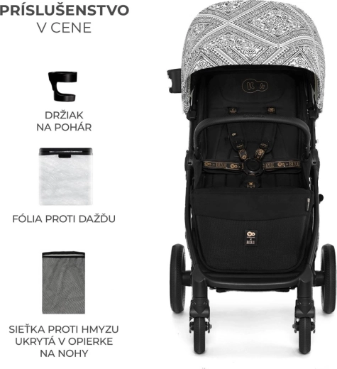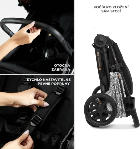 Del opreme je integrirana mreža proti insektom, skrita v opori za noge, držalo za pijačo in dežna prevleka. Varnost zagotavljajo oblazinjeni 5-točkovni pasovi s hitrim nastavljanjem z eno roko ter vrtljiva, odpirajoča zaščitna prečka za udoben sedež otroka. Prostrana košara z nosilnostjo 5 kg sprejme igrače in nakupe. Okvir je združljiv z avtosedeži 0–13 kg s pomočjo univerzalnih adapterjev (prodajajo se ločeno).